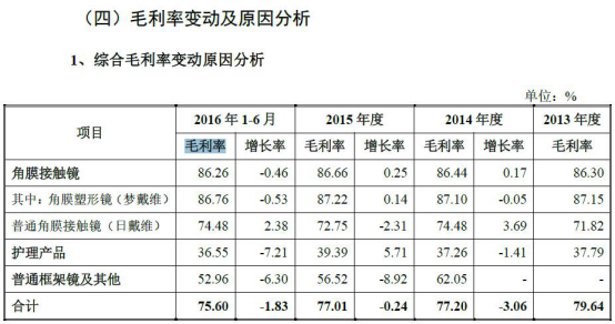 报告期内,公司的主营业务产品分为角膜接触镜、护理产品及普通框架销售。由于普通框架销售主要系公司2014年新成立的销售子公司进行的零星销售,公司自身并不从事普通框架镜的生产,故以下只对角膜接触镜及护理产品的毛利率变动情况进行分析。报告期内,公司的角膜接触镜产品的毛利率水平基本较为稳定,保持在 80%以上的盈利水平。2016 年 1-6 月、2015 年、2014 年角膜接触镜的毛利率较 2013年基本持平。