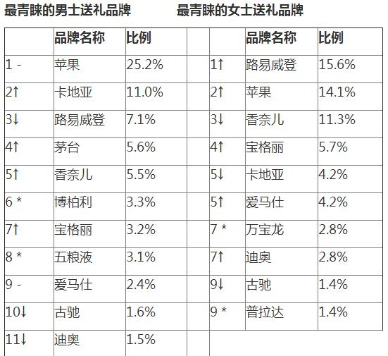 6、送礼:苹果以绝对的优势稳居“最青睐的男士送礼品牌”第一名;卡地亚上升两个名次排名第二;路易威登下降一位到第三;茅台上升2位跻身前五,位居第四;香奈儿从第八上升到第五;三星退出榜单。“最青睐的女性送礼品牌”方面,路易威登取代香奈儿夺得榜首宝座;苹果继去年第三位后又上升一个名次,获得榜眼;香奈儿则下跌两位,位居探花。