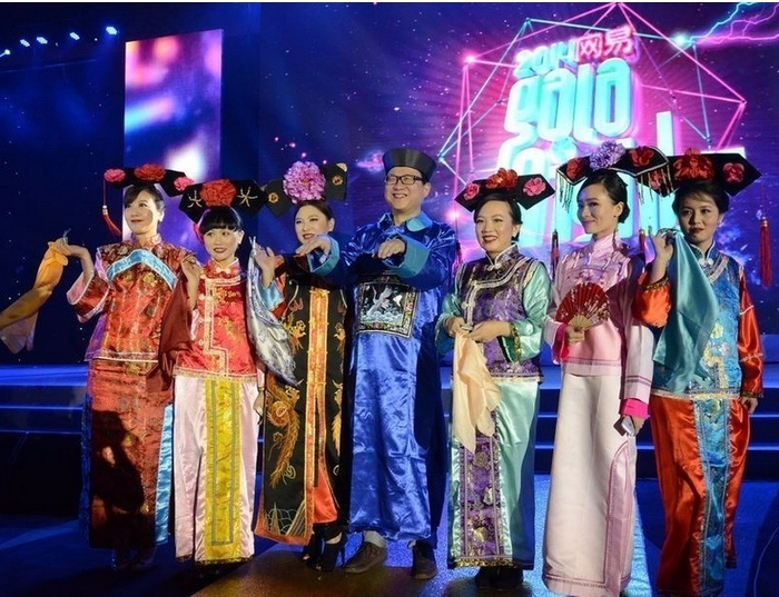 接下来的节目是cosplay(角色扮演),这个蹦蹦跳跳的小僵尸由网易公司创始人兼CEO丁磊扮演,6位美女伴其左右,是一个艳福不浅的僵尸。