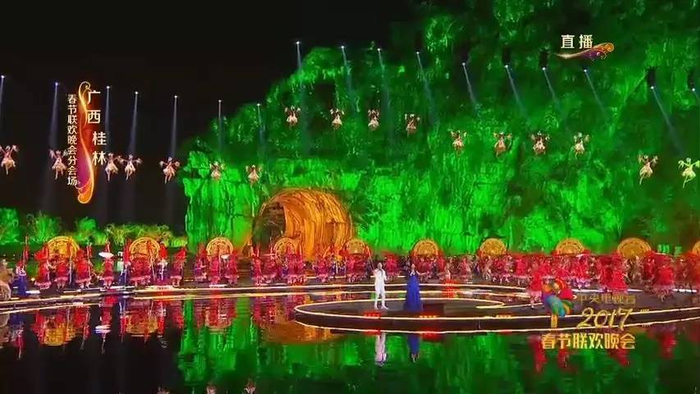 桂林分会场的歌舞《歌从漓江来》,这是“刘三姐”黄婉秋和流行歌手邓紫棋、张信哲的一次跨界合作,灯光与高空威亚、表演结合,十分炫目,做到了“光的运动、运动的光”。