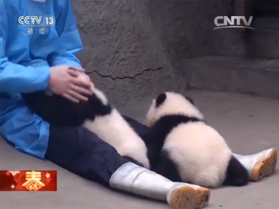 给熊猫宝宝每天测量体温,及时登记它们的健康状况,是每位奶爸奶妈每天的必备功课,每当这时,他们总会露出温情的一面。熊猫宝宝们也很依赖奶爸奶妈,每次只要玩得不尽兴,抱住腿就是不让走。