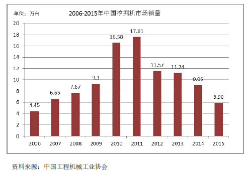 液压破碎锤可与多种液压主机配套使用,如挖掘机、液压装载机、钢包拆包机、拆炉机等,液压破碎锤与挖掘机配套作业最为普遍。由于市场起步较晚,市场认知不足等原因,在新兴市场挖掘机配锤率在15%左右。2006年至2015年,我国挖掘机械市场销售情况如下:
