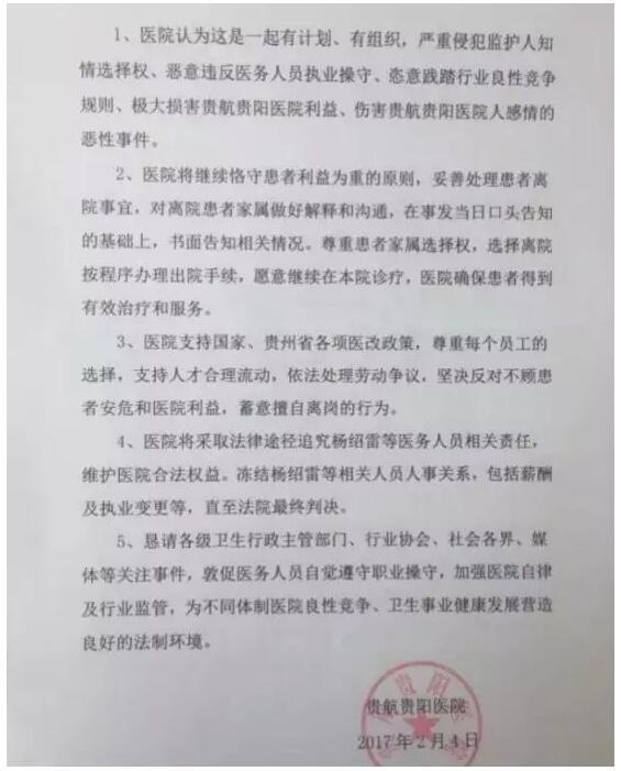 “医院认为这是一起有计划、有组织,严重侵犯监护人知情选者权、恶意违反医务人员职业操守、肆意践踏行业良性竞争规则、极大损害贵航贵阳医院利益、伤害贵航贵阳医院人感情的恶性事件。”该《声明》表示。