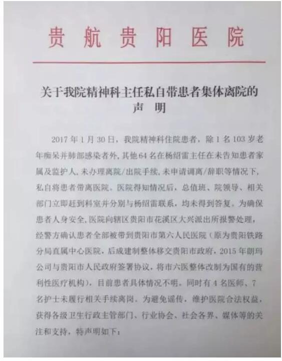 2月4日,贵航贵阳医院发布声明称,经警方确认,1月30日该院64名患者被精神科主任杨绍雷带离至贵阳市第六人民医院(以下简称贵阳六医院),目前患者具体情况不明。