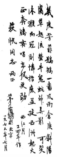 我至今清晰地记得,1972年父亲因病从湖北干校返京后,立即迫不及待地与众多师友恢复了联系。当他怀着久别的思念急匆匆地去拜望茅盾先生时,看到往昔车水马龙的门前空寂一片,会客厅里横一条长竹竿,挂晾着一些衣服,心中感慨万端。茅盾先生的处境、心情可想而知。在这次劫后重逢后,父亲说:“生离生还,得重见尊重而又亲近的前辈老人安然无恙,这种快慰之情,无法言传了。”而茅盾先生则写了五言诗一首,来抒发自己难平的情感: