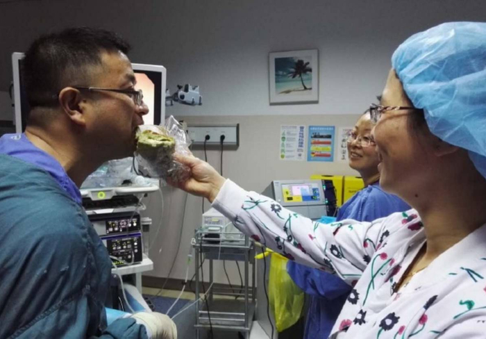 去年12月,浙江一医院主刀医生於亮亮,做了一场历时9小时的消化道肿瘤内镜下挖除术。手术中,他滴水未进,护士买来面包趁手术间隙喂了他几口;左手拿内镜、左臂弯成直角的姿势一直没变过,四五斤重的内镜磨破了橡胶手套…...他说,这是医生的工作常态。