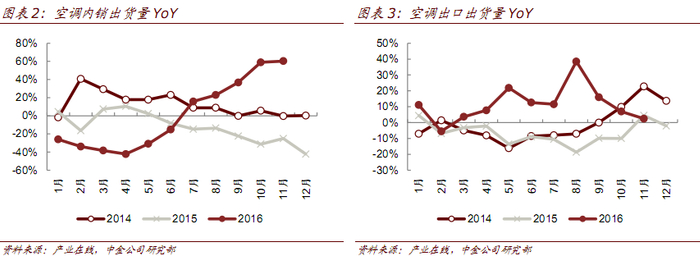 受益于房地产回暖与夏季高温,2016年空调行业完成了探底回升,从去库存周期逐步进入补库存周期,行业竞争格局持续好转。据产业在线统计,2016年家用空调7-12月份连续6个月同比大幅增长,11月家用空调销售776.25万台,同比增长36.1%,其中内销同比增长60.3%,出口同比增长2.5%;12月同比增长43%,其中内销同比增长82%,出口同比增长6%。行业专家表示,空调行业补库存周期仍将持续 2-3个季度,竞争环境仍将保持较宽松的状态。