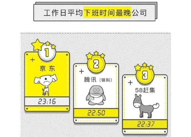 榜单还显示,在工作日平均下班时间最晚公司,京东下班最晚,平均下班时间为23:16。获得第二名的腾讯(盈科)、第三名的58赶集,工作日平均时间都超过晚上22:00。