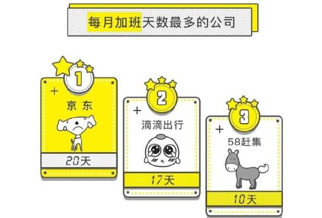 其中,在每月加班天数最多的公司中,京东以20天居榜首。每月的工作日只有22天,而京东的朋友们却要加班20天。滴滴出行、58赶集、新美大员工同样苦逼,每月加班7天以上。