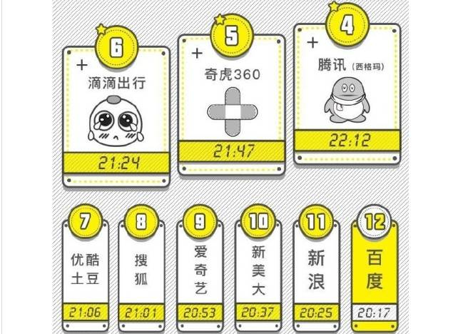 4-12名分别为腾讯(希格玛)、奇虎360、滴滴出行、优酷土豆、搜狐、爱奇艺、新美大、新浪和百度,下班时间均在在20点之后。