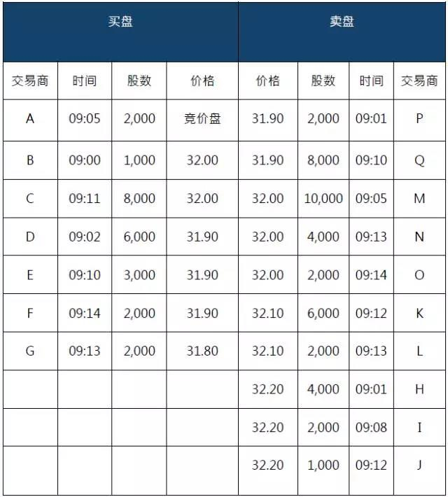 举个例子:以下表格列出在对盘时段开始时在买卖盘记录的所有买卖盘,按配对的优先次序排列。