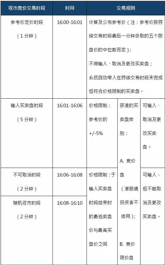港股的收市竞价交易时段首阶段已于2016年7月25日推出,现阶段涵盖恒生综合大型股指数及恒生综合中型股指数的所有成份股、有相应A股在内地交易所上市的H股及所有交易所买卖基金。