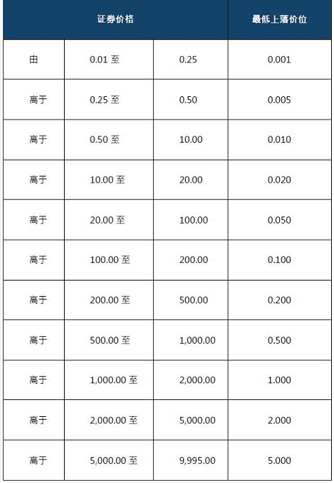 所谓价位,即证券交易可容许的最少价格变动单位。每种股份的价位,视乎其股价而定。以下是证券(债券除外)的价位表。