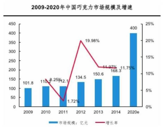 巧克力的市场前景如何?欧睿国际的一份统计显示,欧洲人均年消费巧克力7千克以上,韩国、日本人均年消费约2千克。而目前中国每年人均巧克力的消费量仅为200克。若中国人均年消费巧克力达到1千克,就将成为全球最大的巧克力市场。因此有专家预计,到2020年,我国巧克力市场规模将达到400亿元。