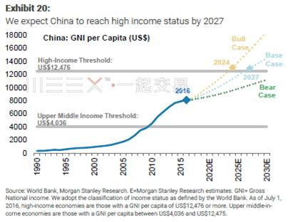 摩根士丹利研究部门在2月14日为中国经济送上重磅“情书”,看多中国经济转型升级,认为中国有能力回避金融冲击,走出中等收入陷阱,预计中国人均GDP将在未来10年内(2027年)从8100美金达到12900美金,于2027年步入高收入国家行列。(根据世界银行2015年定义,人均GDP超过12475美元标准即可称为高收入国家)