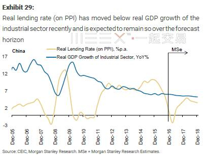 实际借贷利率对PPI通胀率占比已低于工业领域实际GDP增速,大摩预计该形势在未来不会改变