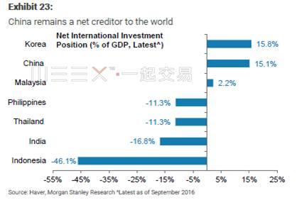 首先,债务规模的飞涨在中国有其庞大的储蓄规模“托底”,而且债务往往流向投融资领域,而非市场消费。其次,中国在国际上处于债权国地位,对海外投资净值占到GDP的13.7%,净资产结构抗冲击能力极强。再者,中国常年维持巨额经常账户盈余和外汇储备,而且并未面临严重的通胀压力,即便银行系统当中存在坏账,中国政府完全有能力通过对市场注入资金,稳住国内流动性状况,避免金融冲击的发生。