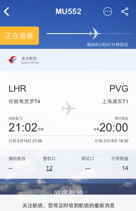 2月15日,澎湃新闻记者在“飞常准”App上查询MU552航班情况,发现该班次于当地时间2月14日21:02从伦敦希思罗T4航站楼起飞,原计划当地时间2月15日16:30到达上海浦东机场T1航站楼。预计实际到达时间为当地时间2月15日20:00。