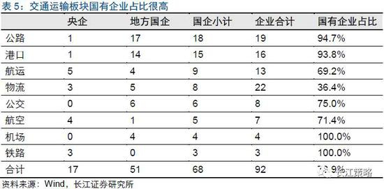 交通运输行业国资控股占比较高。在申万交通运输行业的92家企业中,国资委控股17家,地方政府或地方国资委控股51家,分别占企业总数的18.5%和55.4%,合计占比为73.9%。其中,公路、港口、机场、铁路国企占比均在90%以上。
