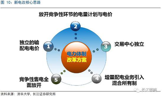 对于电网这种具有区域天然垄断性特征的企业,对于其竞争性的经营环节可全面放开市场准入,使其主体多元化,而对于具有区域垄断性的配电业务,可开展混合所有制提升其内部运营效率,2015年开始的新电改即旨在与此。2015年3月,国务院下发电改9号文《中共中央 国务院关于进一步深化电力体制改革的若干意见》,开启新一轮电改序幕,本轮电改的的核心思路分为五点:独立的输配电价、放开竞争性环节的电量计划与电价、交易中心独立、竞争性售电全面放开、增量配电业务引入混合所有制。其中最后两条“竞争性售电全面放开”、“增量配电业务引入混合所有制”为新电改的两大具体实施途径,两条途径均直指电网配售电环节的市场主体的多元化与其所有权的多元化。