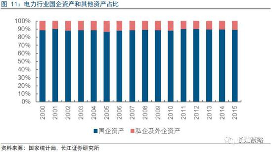 电力行业具有公用事业属性,属于基础性产业,对国民经济的发展起支柱性作用,因此行业内国有资本高度集中,形成了国家绝对控股的局面。在国家统计局披露的全电力行业资产中,国企资产自2000年起至今持续占据着90%左右的比例,私营企业及外企仅占10%左右。考虑到国企改革要求实现国有资本保值增值、提高国有经济竞争力、放大国有资本功能,而电力行业内国有资本高度集中,必将成为国企改革的关键领域。