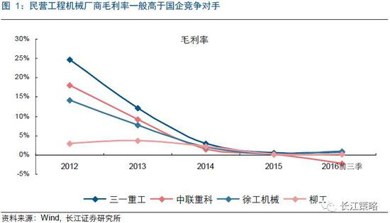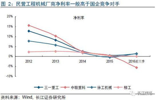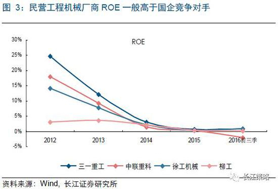 就效率而言,在同业的竞争对手中,民企一般情况下比国企具有更强的盈利能力。从工程机械来看,三一重工、中联重科在过去几年行业下行阶段,凭借民营机制灵活、效率高的优势,在毛利率、净利率、ROE上均一定程度上领先于身为国企的徐工机械和柳工。但同时,我们也注意到,当2015年以来行业处于底部盘整期时,国企和民企之间的效率差距显著缩小。