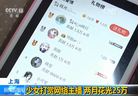 原标题:上海一13岁少女打赏网络主播 两月花光25万