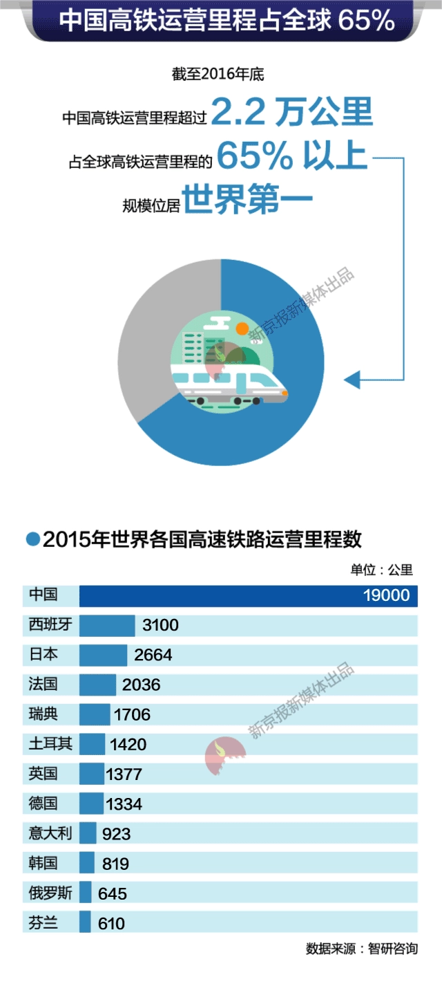 据了解,“十二五”期间,我国一共投入35800亿元,建成3万公里铁路。截至去年底,中国高铁的运营里程已达2万多公里,占全世界高铁总量的65%。据世界银行的测算,中国高铁二等座每公里票价在0.42元左右,是其他国家的1/4到1/5。只不过,那些发达国家的人均收入也是中国好多倍……