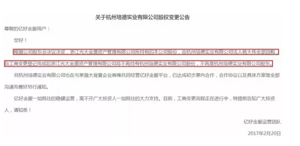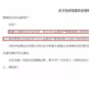 根据亿好金服发布的公告,公司股东会决议决定,浙江光大金盛资产管理有限公司(下称“光大金盛”,由浙江光大旗下公司出资成立)所持有的本公司股份,由杭州培德法人杨大伟全部回购,自工商变更登记完成后,光大金盛将不再持有杭州培德股份,不再是杭州培德股东。公开资料显示,亿好金服运营方为杭州培德实业有限公司(下称“杭州培德”)。