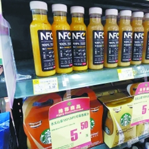 农夫山泉的常温NFC果汁在去年11月已经完成全国铺货,渠道包括便利店和普通超市卖场,300毫升仅售6-8元,促销时甚至低至5.5元。农夫山泉方面表示,之所以推出常温NFC果汁,是因为常温储运的100%NFC生产规模可以更大,储运成本较低,因此价格更亲民,但是产品风味依然很好,购买后冷藏口感尤佳。