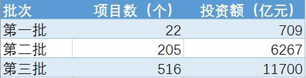 财政部全国PPP综合信息平台项目库(下简称项目库)于2016年初正式启动运行。截至2016年12月末已推出3批国家示范项目。其中,2014年第一批22个,投资额709亿元;2015年第二批205个,投资额6267亿元;2016年第三批516个,投资额1.17万亿元。