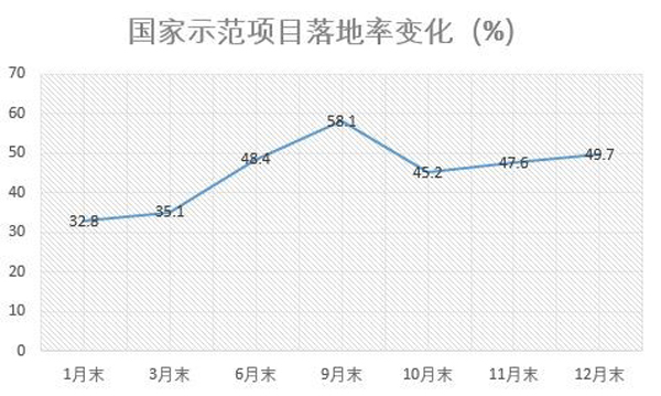 国家示范项目落地率变化虽然呈现起伏,1月到9月,示范项目落地率稳步提升,10月第三批示范项目数据纳入计算,故落地率有所下降,11月以来落地率又稳步提升。