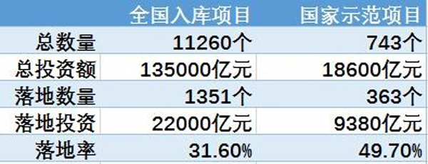 据季报,截至2016年12月末,全国入库项目共计11260个,总投资额13.5万亿元。其中,已签约落地的项目1351个,投资额2.2万亿元,落地率31.6%。国家示范项目743个,总投资额 1.86万亿元。其中,已签约落地的示范项目363个,投资额达9380亿元,落地率49.7%。第一、二、三批示范的落地率分别为100%、62.4%、42.9%。