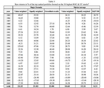 先看看美国版。蒂尔堡大学研究生R.H. Blij在对“神奇公式”做假设研究时发现,如果按照格林布拉特的投资方法从1985年开始投资,每年进行组合重组,投资人将会得到年均23.32%的收益。如果投资人以“神奇公式”的方式投资1000美元,到2010年累计回报将达到92277.74美元,累计回报率高达9128%。与此同时,标普500指数的年均回报率为8.21%,累计回报为5372.48,累计回报率437%。