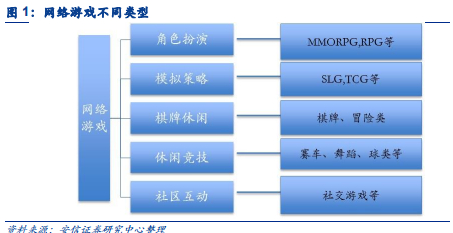 网络游戏,按照游戏终端不同,可分为三种:客户端游戏、网页游戏以及移动端游戏;按类型划分,可分为五种:角色扮演、模拟策略、棋牌休闲、休闲竞技和社区互动。