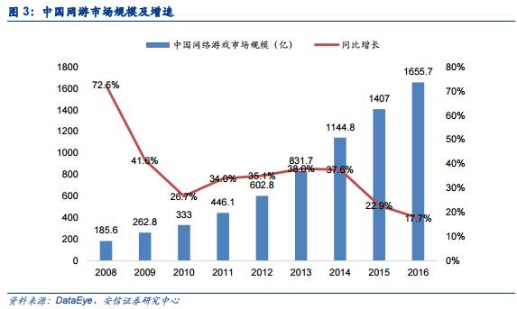 2005年开始,网游行业进入快速增长期,在2013年之后,行业增速连续下滑,到2016 年时,增速仅有17.7%。