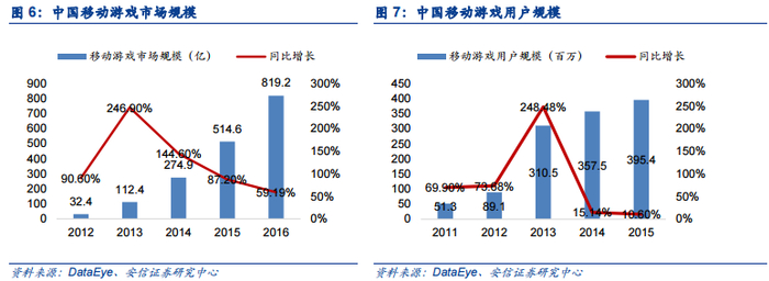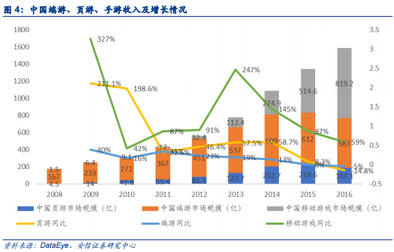 仅剩的手游市场,增长比较乐观。此次网易业绩推动,最主要的因素也是手游业务,2016年4季度,该部分占整体收入的64%,同比增长高达83%。同年,手游市场规模达到819亿,首次超过端游的583亿,成为第一大细分市场,同比增长59%,较之2015年增速虽有放缓,但仍处于快速成长期。