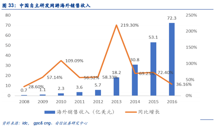 中国自主研发的网游,在海外的销售收入虽一直保持增长,但2014年开始,增速下滑十分明显,到2016年增速仅有36.16%,同比下降50%。