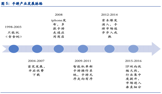 手机游戏起源于诺基亚的贪食蛇,以iPhone为标志的智能手机来临后,手机游戏开始规模化发展,2012年,行业迎来爆发式增长。近年来,手游行业增速下滑,并且集中度明显提升。