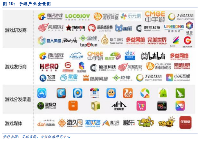 行业的天花板越来越近,业内的企业数量依旧庞杂。手游产业链参与者,包括游戏研发商(如:腾讯游戏、网易游戏、巨人网络)、游戏发行商(如:腾讯游戏、昆仑万维、智明星通)、分发渠道(iOS 和 android)以及游戏媒体(如:游久网、游戏多)等。