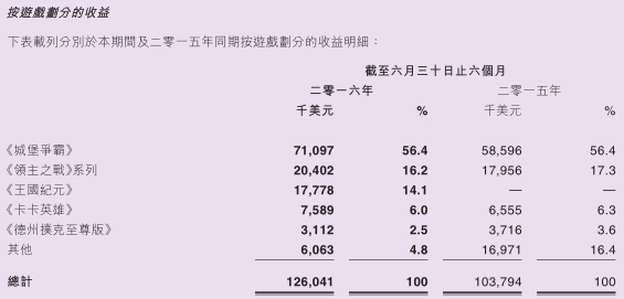 公司主要的产品有《城堡争霸》、《领主之战》系列和新产品《王国纪元》等,每款产品的收入相较去年同期都有一定的增长。