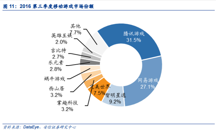市场占比中,腾讯和网易遥遥领先,2016年第三季度合计占比58.6%,而近期网易公布的新数据表明,四季度的腾讯和网易,合计占比将增至70%以上,进一步压缩其他中小游戏商及发行商等第三方的空间。
