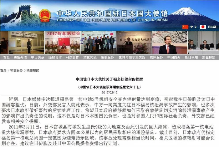 在2月12日,福岛核电站2号机组安全壳内部达到最大辐射值后,中国驻日使馆在官网上发布了一则公告,希望日本政府能够就如何采取有效措施切实消除核泄漏事故产生的影响作出负责任的说明。这不仅是对日本本国国民负责,也是对邻国人民和国际社会负责。公告还提到相关区域的核辐射可能会长期存在,建议在日侨胞及赴日中国公民妥善安排出行计划。