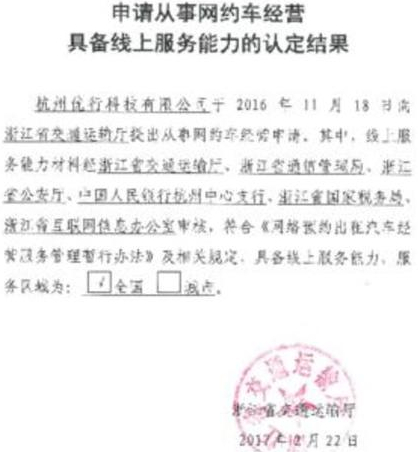 智通财经获悉,近日,吉利汽车(00175)旗下子公司曹操专车(CAOCAO)通过浙江省交通运输厅、公安局等相关部门审核,获得浙江省交通运输厅下发的《申请从事网约车经营具备线上服务能力的认定结果》,具备线上服务能力,成为一家获得经营资质的新能源汽车共享出行平台。