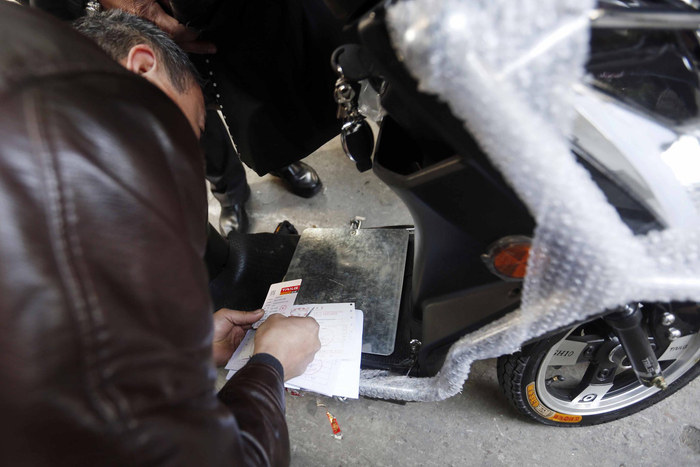 7、验车人员核对电动车的钢印。针对外卖、快递这些置换电动车数量较大的企业,交警采取预约登记、集中办理、上门查验等措施进行分流,不影响普通市民办理登记上牌业务。目前,交警部门已为饿了么、美团等企业办理了3000余辆电动车的上牌手续。