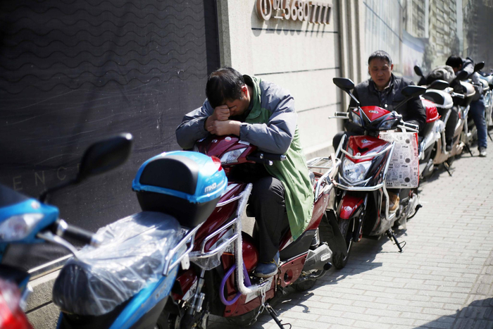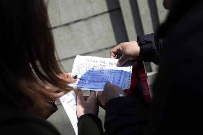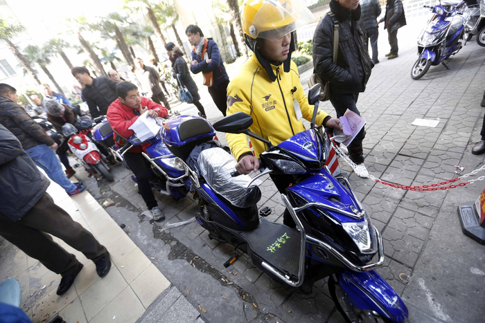 6、一位美团外卖的外卖员推着一辆崭新的、尚未撕去保护膜的电动车,到指定窗口验车。长期以来,外卖、快递行业的加盟商只提供“抢单”平台,电动车需要员工自备。为了追求速度快和续航长,大多数员工使用的电动车经过非法改装,存在超长、超宽、超高、大功率等乱象,容易诱发交通事故。