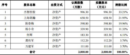 而在2004年成立时杨小奇持股26.00%,2014年变更股份公司后杨小奇持股11.33%,杰智控股持股33.21%;上海朗瀚持股21.95%。