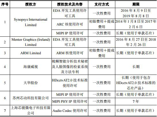 截至2016年12月31日,公司被授权使用的主要专有技术分别为EDA开发工具使用许可工具、ARC核使用许可、MIPI IP使用许可、EDA开发工具使用许可工具、ARM核使用许可、视频智能分析技术秘密及人脸图像的检索系统及方法专利、HDcctvAT2.0技术标准使用许可、MIPI IP使用许可、MIPI PHY IP使用许可、Audio Codec使用许可。