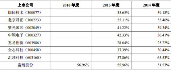 上述公司暂无2016年毛利率数据,2014年至2015年国民技术毛利率分别为39.18%、35.65%;北京君正同期毛利率分别为55.46%、55.11%;紫光国芯同期毛利率分别为39.34%、41.22%;中颖电子同期毛利率分别为36.41%、42.33%;兆易创新同期毛利率分别为25.22%、28.64%;全志科技同期毛利率分别为30.44%、37.39%;汇顶科技同期毛利率分别为65.53%、57.86%。