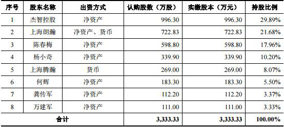 值得注意的是,2014年整体变更为股份公司后,公司第一大股东为杰智控股,持股33.21%。资料显示,杰智控股、上海朗瀚均成立于2010年,上海腾瀚成立于2014年。